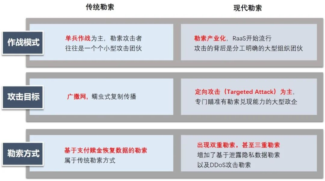 首先,勒索即服务RaaS(Ransomware-as-a-Service)的兴起使得勒索的作战模式从传统的小型团伙单兵作战,转变为模块化、产业化、专业化的大型团伙作战,其造成的勒索攻击覆盖面更广,危害程度显著增加;其次,对于勒索攻击的目标,也从过往的广撒网蠕虫式攻击升级成为针对政府、关键信息基础设施、各类企业的定向攻击;另外,从勒索方式来看,现代勒索攻击已经从传统的支付赎金恢复数据的勒索方式,演化为同时开展双重勒索,甚至三重勒索。