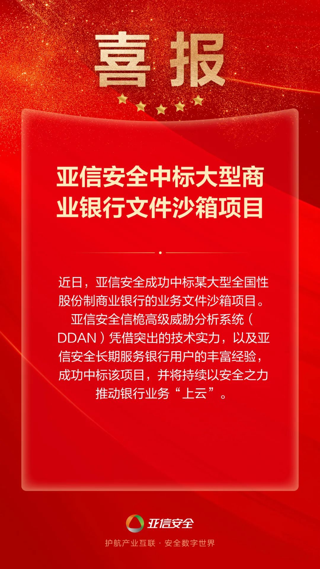 近日,亚信安全成功中标某大型全国性股份制商业银行的业务文件沙箱项目。亚信安全信桅高级威胁分析系统(DDAN)凭借突出的技术实力,以及亚信安全长期服务银行用户的丰富经验,成功中标该项目,并将持续以安全之力推动银行业务“上云”。