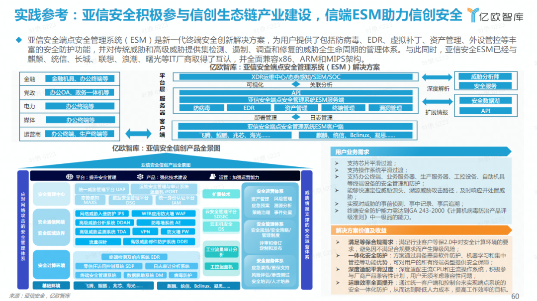 作为信创安全的优秀实践,报告中特别收录并推荐了亚信安全信端安全管理系统(ESM)的优秀实践,以及积极参与信创产业生态链建设的优秀成果。信端ESM是新一代终端安全创新解决方案,集防病毒、EDR、虚拟补丁、资产管理、统一管理等丰富安全防护功能为一体,为用户提供了包括传统威胁和高级威胁的检测、遏制、调查和修复的全生命周期管理。此外,亚信安全ESM还具备了包含恶意软件检测引擎、攻击行为检测引擎、机器学习检测引擎和威胁情报数据湖的“三擎一湖”技术,集成了威胁情报、攻防对抗、机器学习等多种能力,可为金融行业用户提供更加安全可靠的业务操作环境。