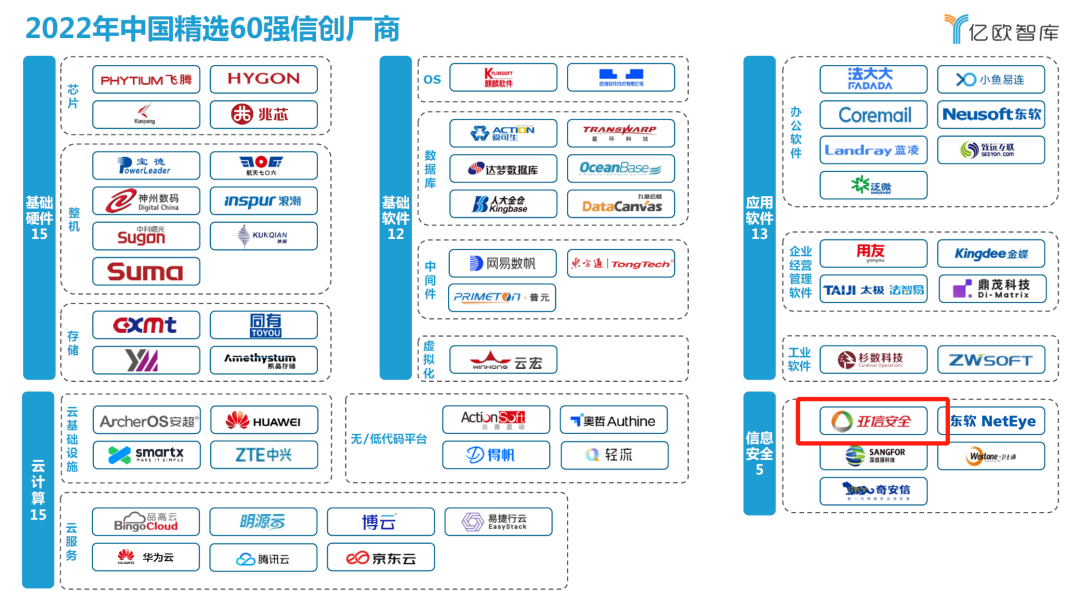 近日,亿欧智库《2022中国信创产业竞争力研究报告及精选60强信创厂商》正式发布。亚信安全凭借在信创安全领域的突出技术实力入选信息安全领域“精选信创厂商”。