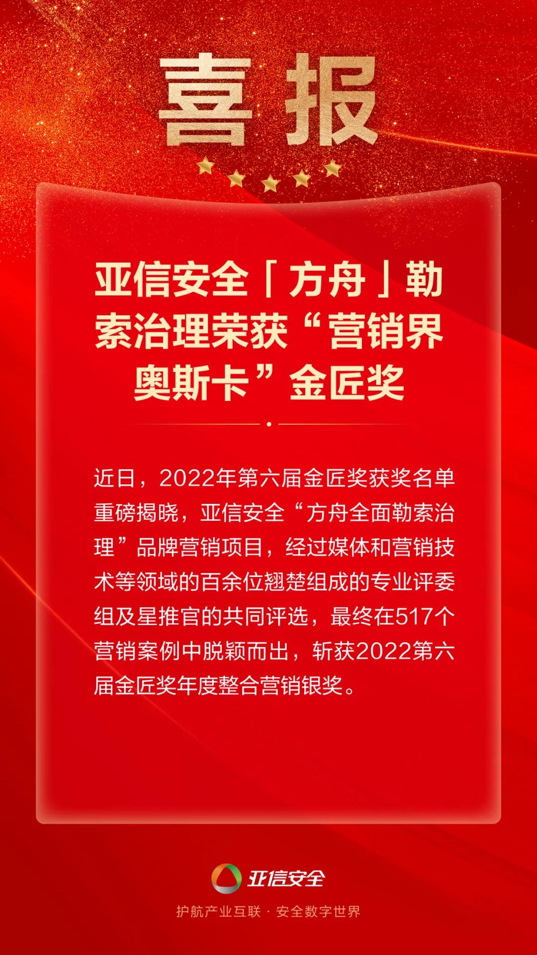 近日,在业界享有“营销奥斯卡”美誉的“2022第六届CMO金匠奖”获奖结果重磅揭晓。亚信安全「方舟」全面勒索治理行动的品牌营销项目,荣获金匠奖B2B年度整合营销银奖!