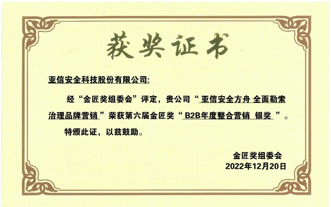 金匠奖(Golden Craftsman Award)是国内颇具影响力和权威性的营销奖项之一,自2017年至今已成功举办五届。金匠奖聚焦优秀营销,所有营销奖项评选也是少有的以实战案例作为申报和评判的主要依据,被誉为“营销界奥斯卡”,深受营销界的认可和推崇。今年金匠奖,由媒体和营销技术等领域的百余位翘楚组成专业评委组及星推官,经过严格公正的评审,亚信安全「方舟」项目在517个营销案例中脱颖而出,斩获年度整合营销银奖殊荣。