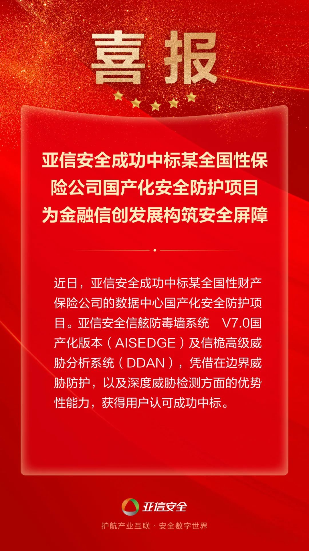 近日,亚信安全成功中标某全国性财产保险公司的数据中心国产化安全防护项目。亚信安全信舷防毒墙系统 V7.0国产化版本(AISEDGE)及信桅高级威胁分析系统(DDAN),凭借在边界威胁防护,以及深度威胁检测方面的优势性能力,获得用户认可成功中标。