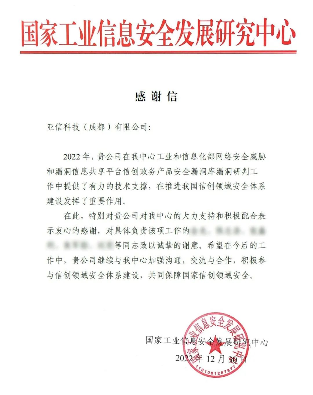 近日,国家工业信息安全发展研究中心向亚信安全发来感谢信,对亚信安全在工业和信息化部网络安全威胁和漏洞信息共享平台信创政务产品安全漏洞库漏洞研判工作中的表现给予了高度肯定和感谢。并期望未来和亚信安全同心协力,共同推进我国信创领域安全体系建设。