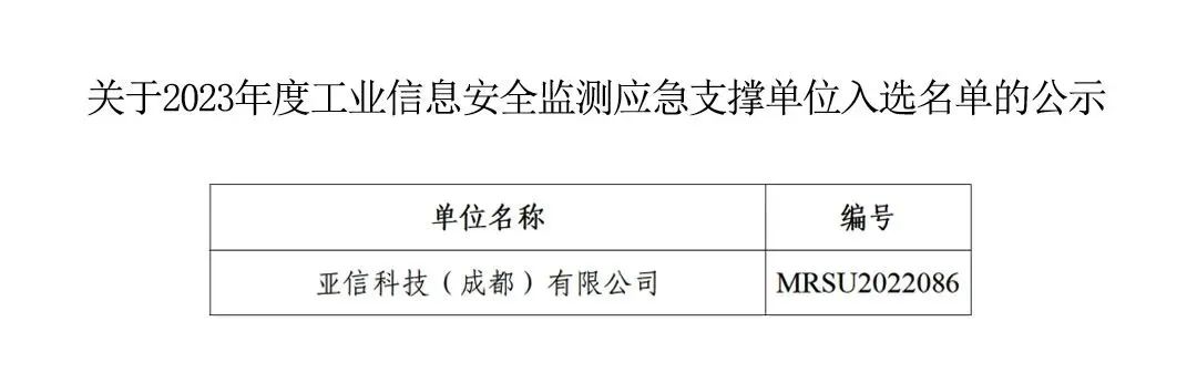 此外,亚信安全还积极参与国家工业信息安全发展研究中心开展的各项工作,高度配合完成中心的各项安排,为我国信创领域建设提供了安全支撑。2022年底,亚信安全还凭借全面的技术能力及核心竞争力、丰富的应急支撑经验、可靠的产品质量等方面的综合优势,成功入选2023年度工业信息安全监测应急支撑单位。作为支撑单位,亚信安全积极发挥在风险监测、事件处置、信息共享、能力建设、服务支撑等方面的优势,增强工业信息领域重大、突发网络安全事件的应对能力。