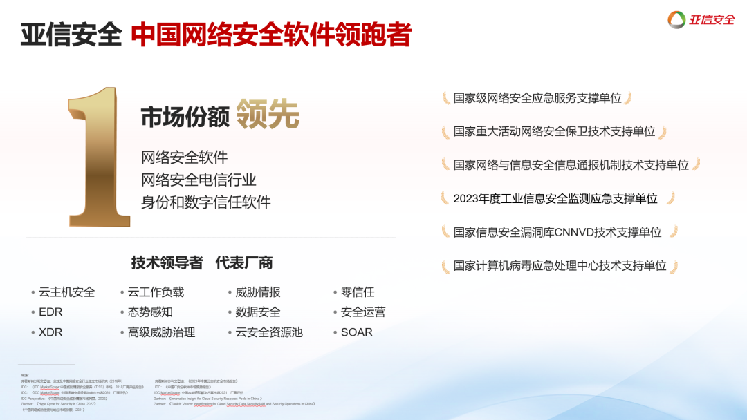 目前,亚信安全已经在核心技术研发、重大项目攻坚、产业生态建设等方面取得了众多成果:成功完成了200多项重要芯片、操作系统及国产服务器的安全产品的兼容互认;并联合产业链上下游,搭建合作共进的生态体系,赋能千行百业的数字化发展;同时亚信安全的技术实力也受到业界认可,在中国网络安全软件领域、中国网络安全电信行业细分市场以及身份和数字信任软件市场排名第一,更实力入选“中国信创产业竞争力60强”、“信创产业领军企业100强”,以及威胁情报、EDR、XDR等细分技术领域的领导者象限等,以突出的安全技术及方案持续引领行业发展。