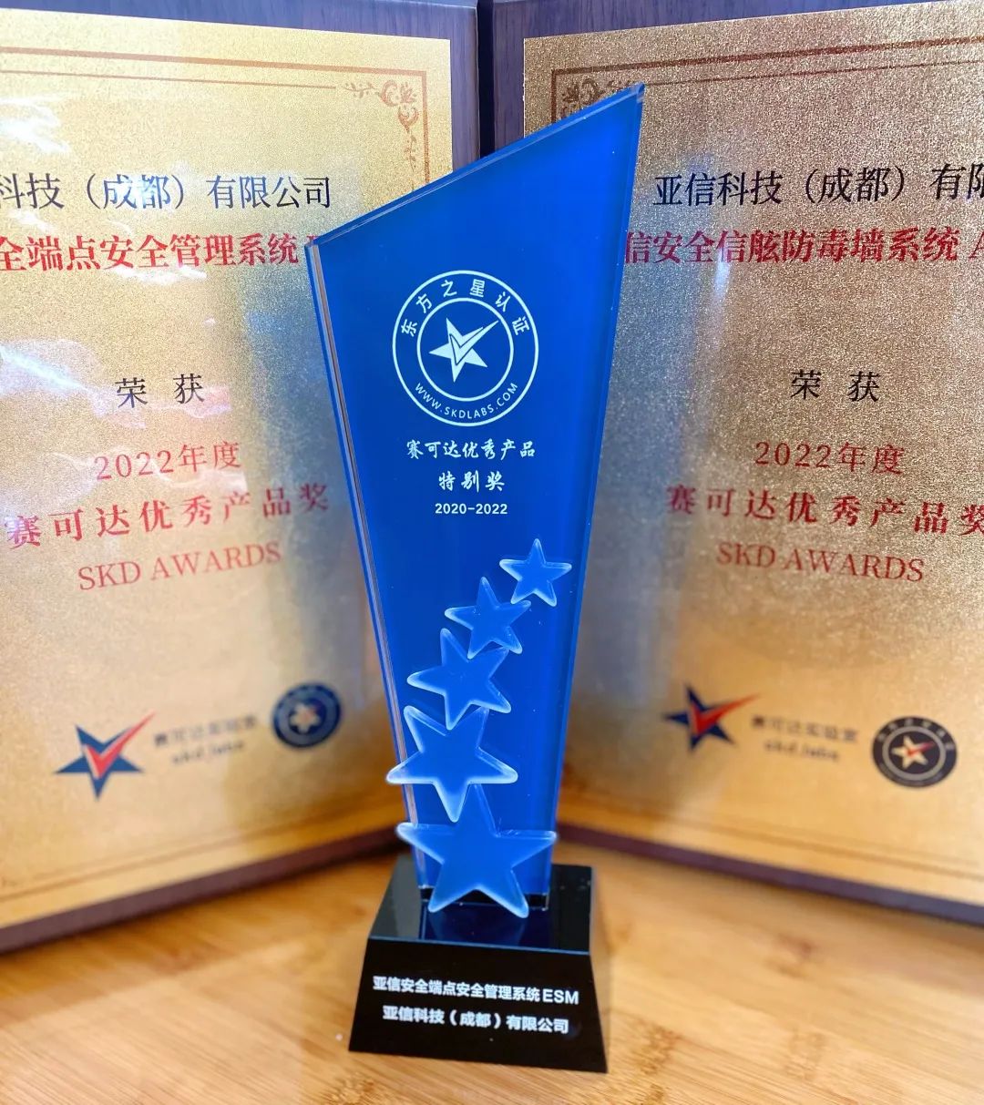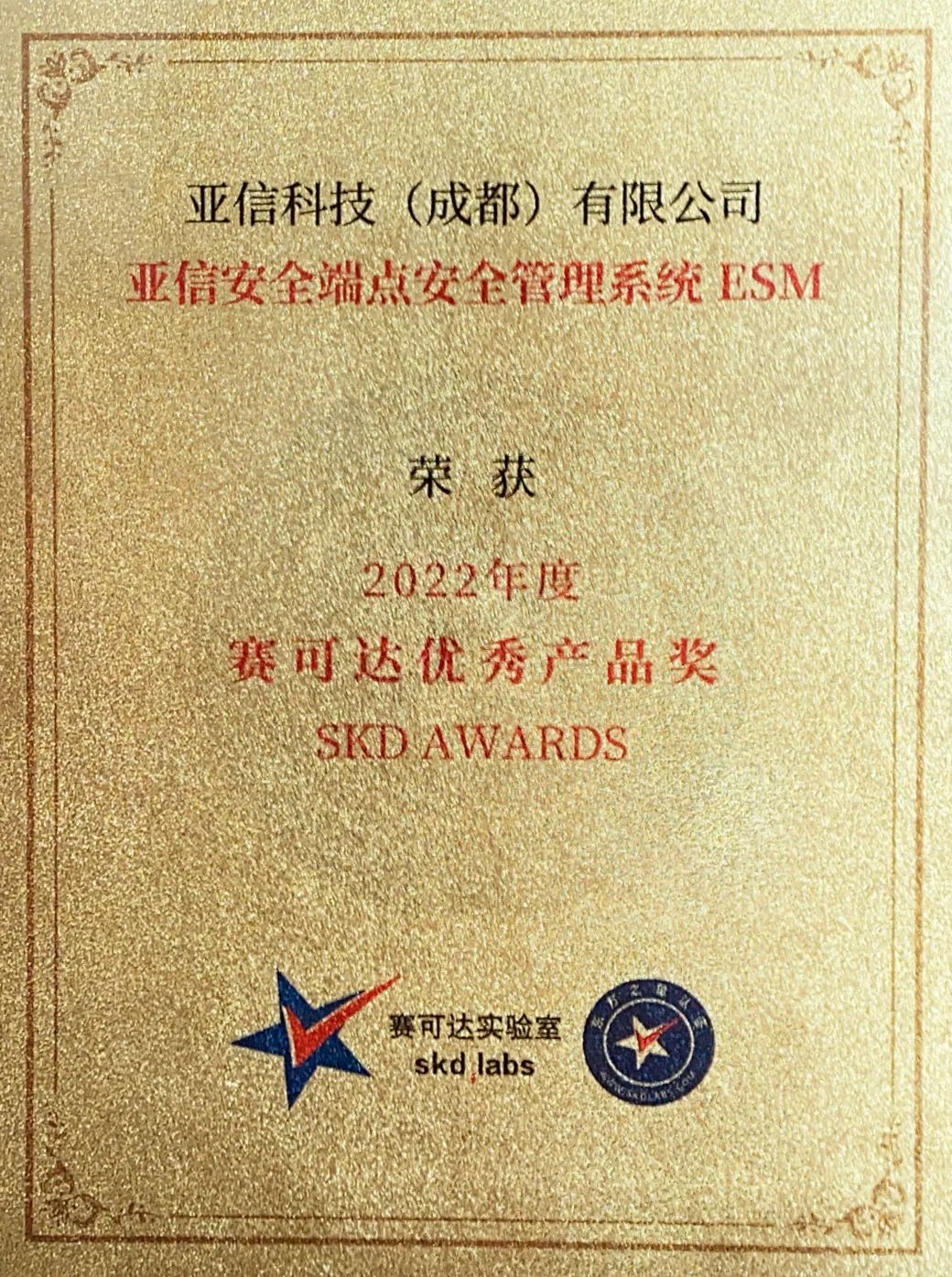 近日,赛可达实验室正式发布2022年度赛可达优秀产品奖(SKD AWARDS)获奖名单,亚信安全信端和信舷系列三款产品实力入选:信端病毒防护(OfficeScan)、信端端点安全管理系统(ESM)、信舷防毒墙(AISEDGE)在评选中表现卓越,在众多产品中脱颖而出,以突出的产品能力和技术实力成功登榜。