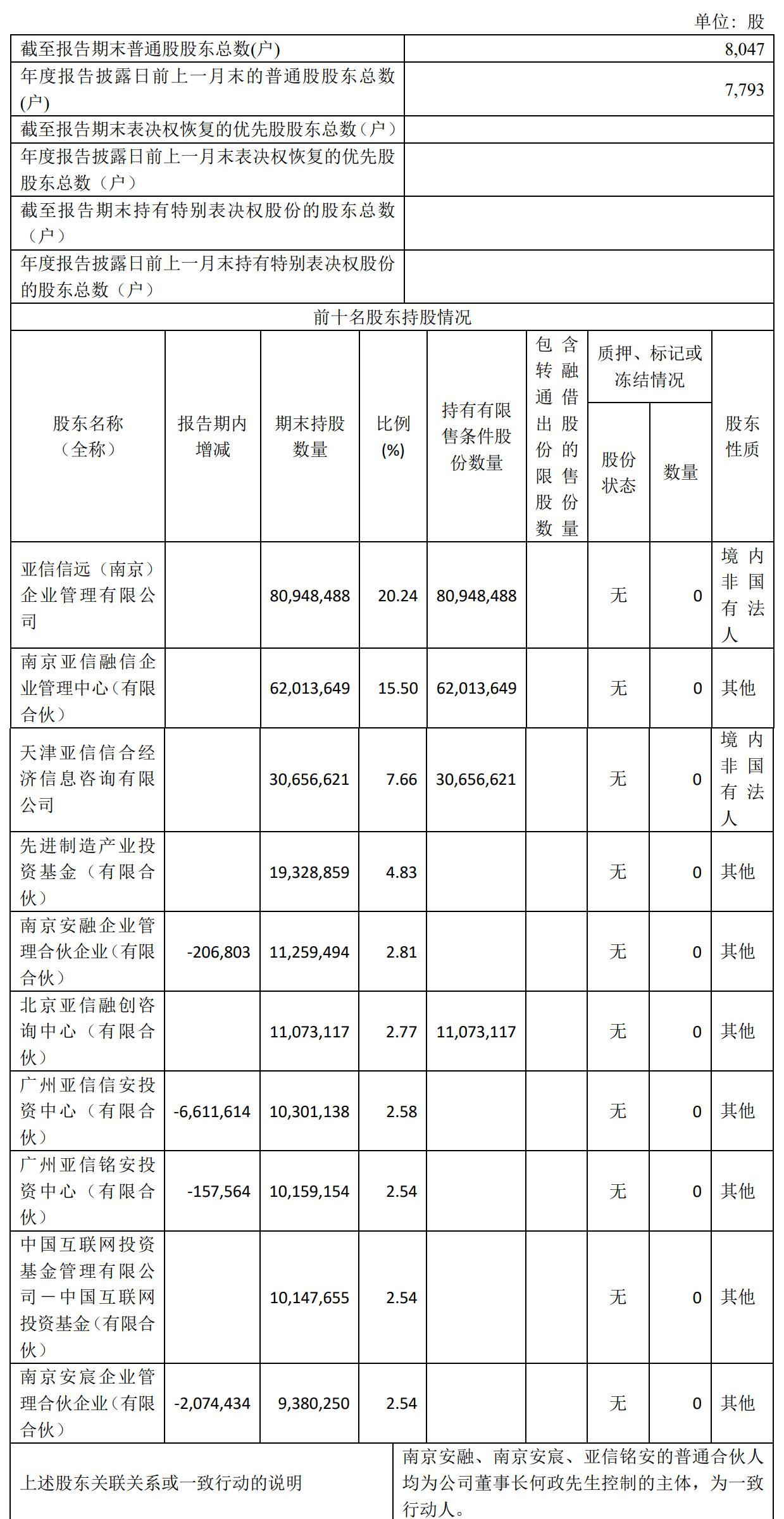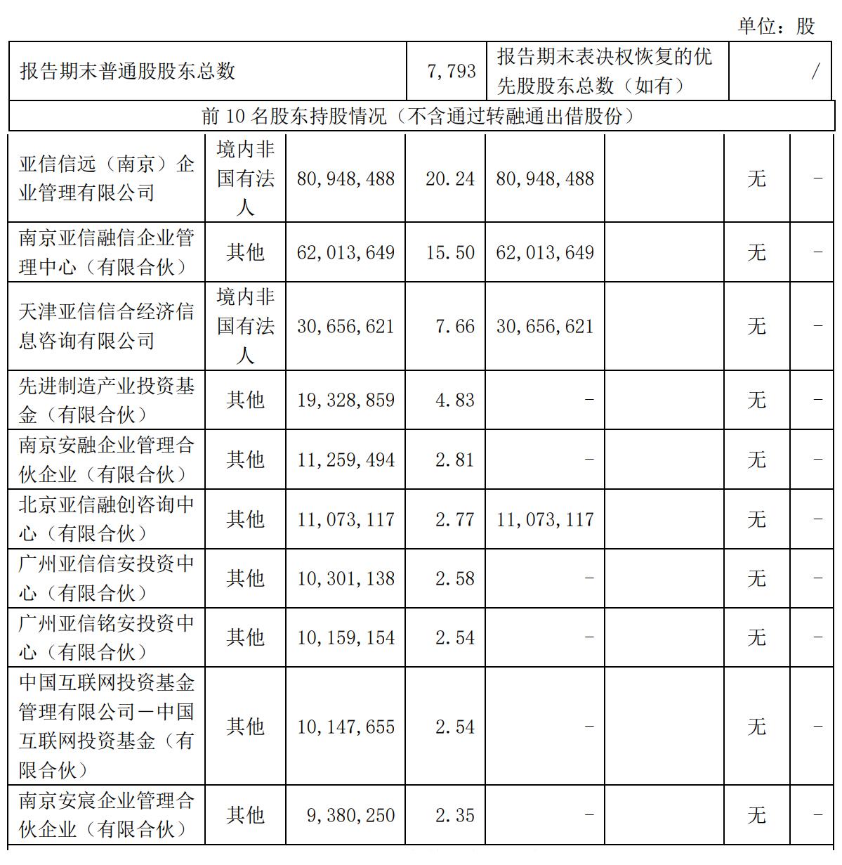 截至2023年12月31日,亚信信远(南京)企业管理有限公司持股为20.24%,南京亚信融信企业管理中心(有限合伙)持股为15.5%,天津亚信信合经济信息咨询有限公司持股为7.66%,先进制造产业投资基金(有限合伙)持股为4.83%;