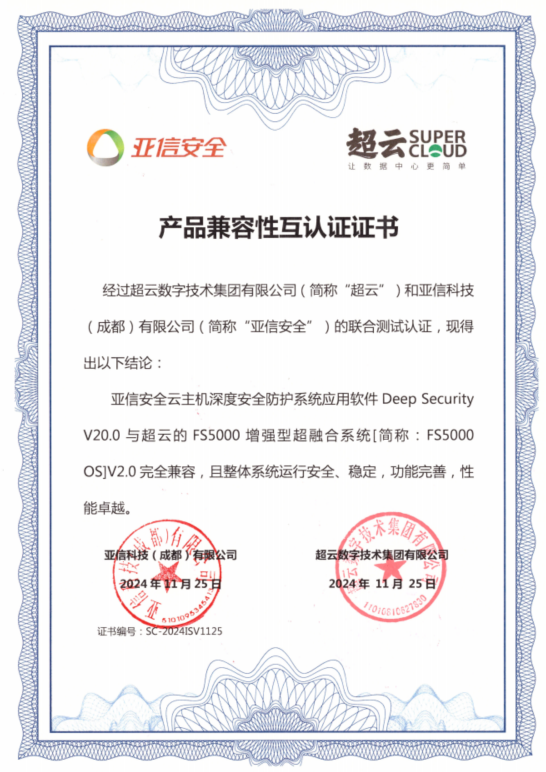 在数字化转型的大背景下,算力产业发展呈现新趋势、新需求和新课题。亚信安全充分发挥“懂网、懂云、懂安全”的优势,积极联动产业重要力量,共同助力构建安全、可靠、强大的算力体系。此次与超云成功完成产品的兼容性互认,双方将合力为用户带来高安全性、高性能的算力云解决方案。