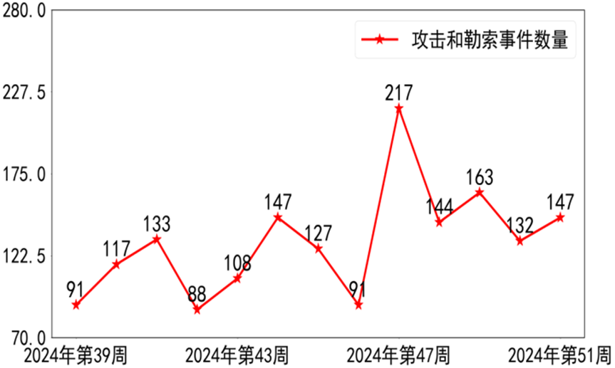 本周全球共监测到勒索事件147起,本周勒索事件数量与上周相比略有上涨。勒索事件趋势见图1.1。