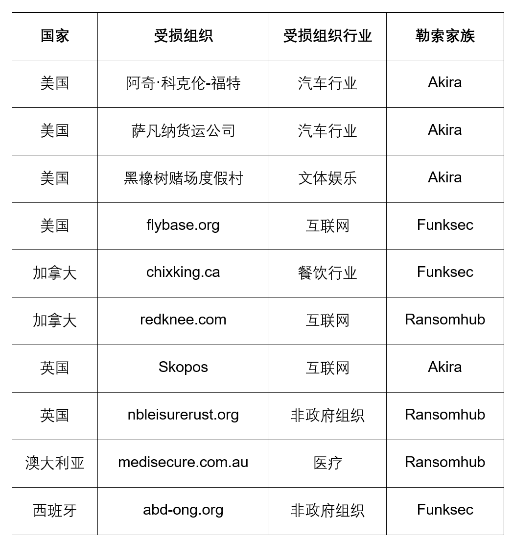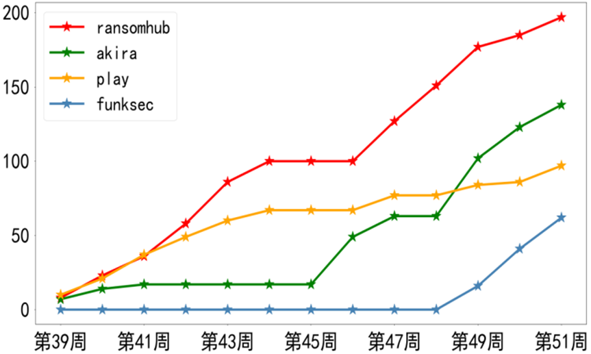 从整体上看Ransomhub依旧是影响最严重的勒索家族;本周Funksec和Akira也是两个活动频繁的恶意家族,需要注意防范。