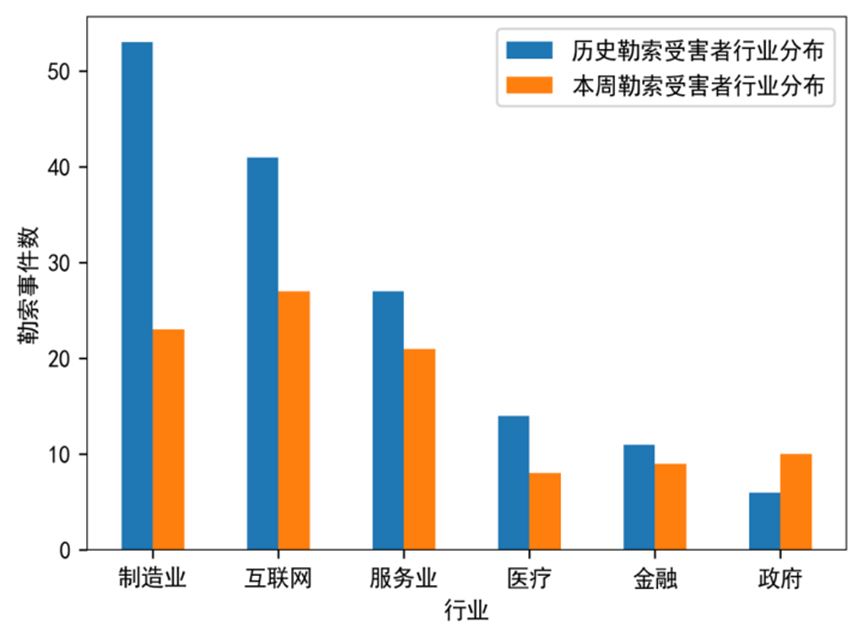 本周全球勒索事件受害者所属行业和历史对比趋势图如图1.2所示。从图中可知,除政府行业外各行各业勒索事件数量与上周相比均有所下降。勒索事件趋势见图1.2。