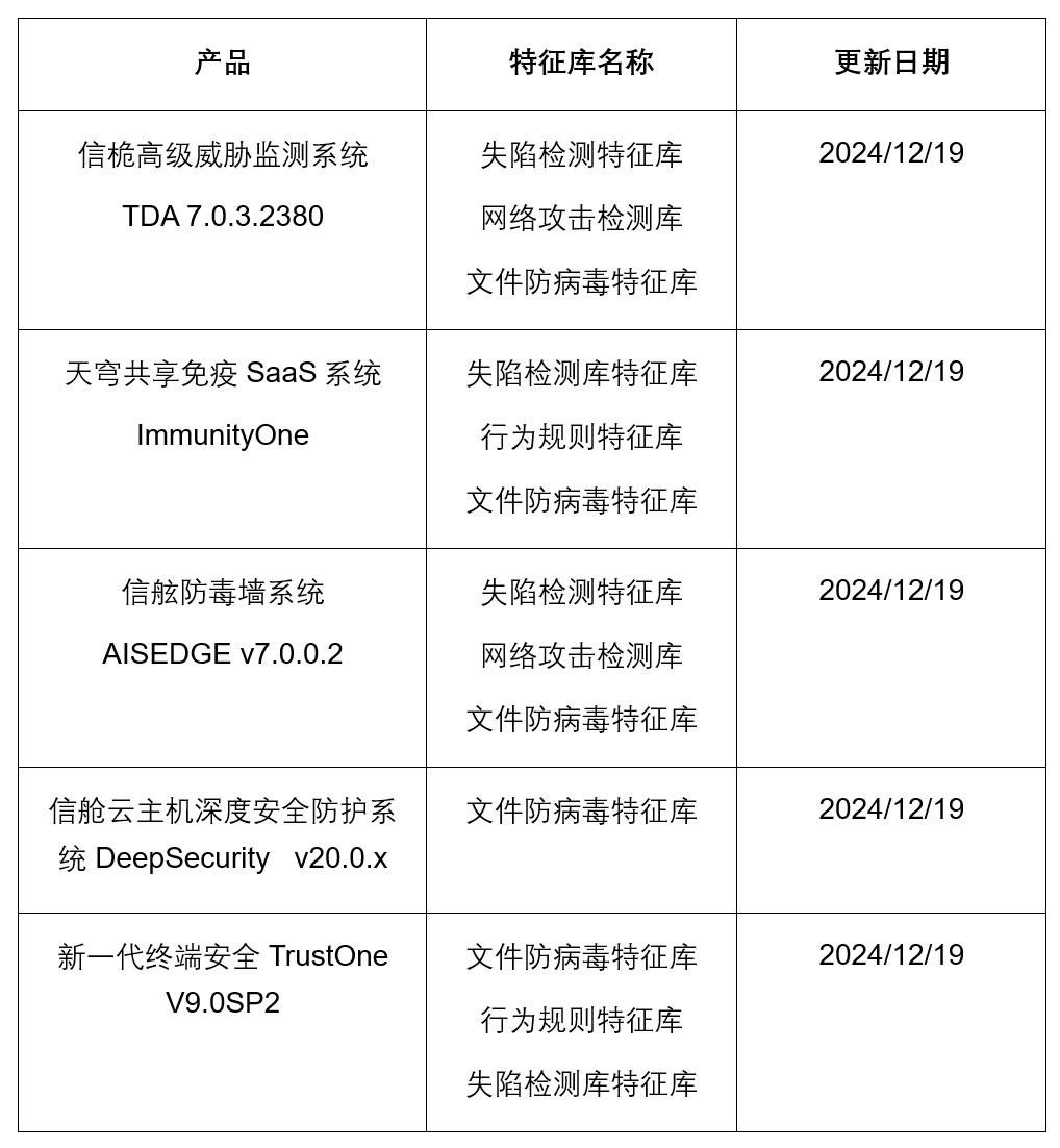 针对全球勒索事件频发的威胁态势,亚信安全推出勒索治理方案,针对近期活跃勒索事件已具备检测能力,请提醒客户及时升级产品及特征库。最新产品版本和特征库列表如下: