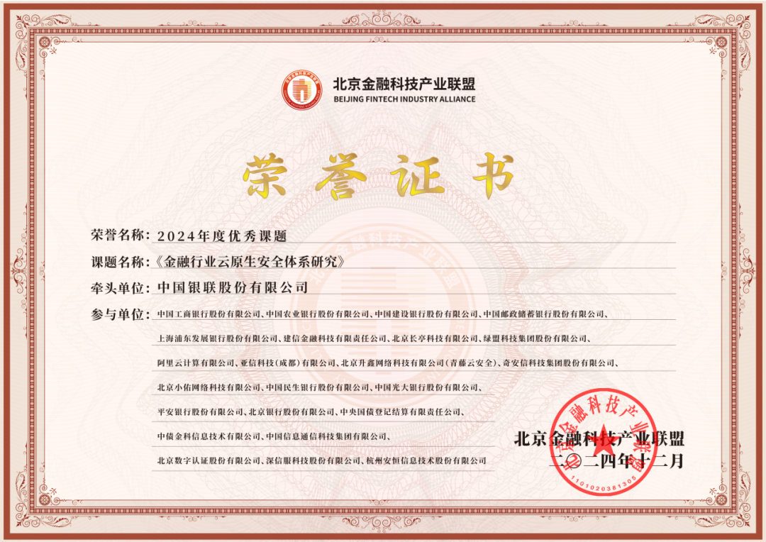 近日,由中国银联股份有限公司牵头,亚信安全作为联合牵头单位深度参与的《金融行业云原生安全体系研究》报告,荣获北京金融科技产业联盟颁发的2024年度优秀课题的殊荣。