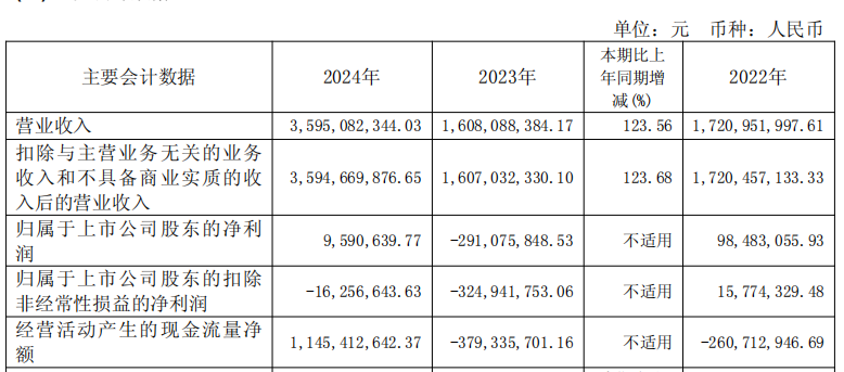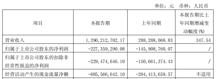 公司昨日发布2025年第一季度报告显示,公司一季度实现营业收入12.90亿元,同比增长347.54%;归属于上市公司股东的净利润-2.27亿元,上年同期为-1.46亿元;归属于上市公司股东的扣除非经常性损益的净利润-2.29亿元,上年同期为-1.51亿元;经营活动产生的现金流量净额为-6.86亿元。