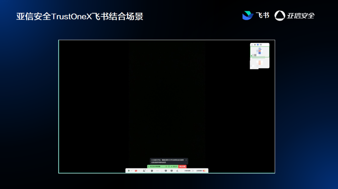 当用户通过飞书会议投屏涉密内容时,TrustOne实时介入,参会人员视角自动黑屏,严防敏感信息外泄,为机密会议保驾护航。