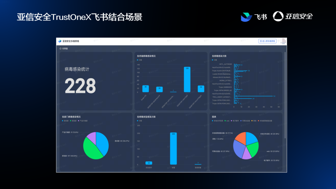 依托“飞书多维表格+ TrustOne”联动,企业可直接在飞书平台内查看全网终端的实时病毒感染态势与处置进展,安全管理效率大幅跃升。