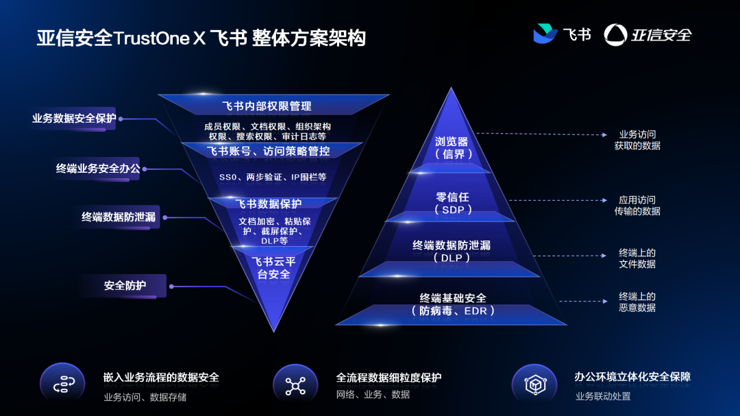 在飞书加速成为企业核心办公平台的背景下,亚信安全TrustOne与飞书实现深度协同,构建了清晰的安全边界与能力互补: