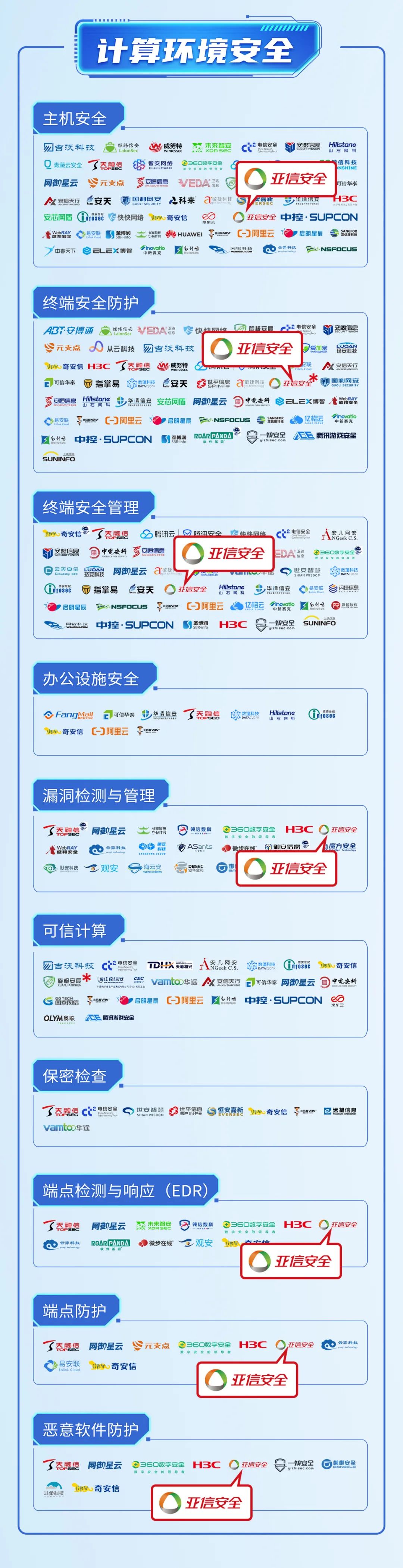 评审结果显示,亚信安全凭借全面的产品技术能力,成功入围15个一级目录、95个细分领域,充分彰显了其技术实力。