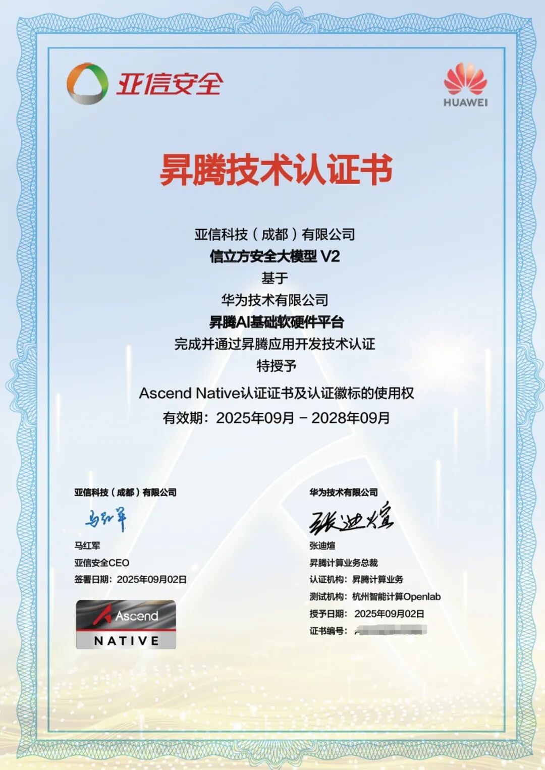 此次认证标志着信立方安全大模型在昇腾AI基础软硬件平台上的兼容性、性能表现及技术适配性得到认可,更成为亚信安全与华为在人工智能安全领域深度协同的重要成果。