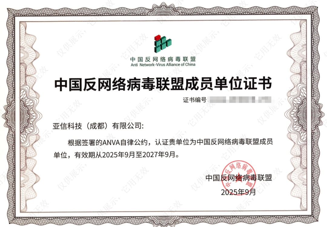 在数字经济加速渗透、网络威胁日趋复杂的当下,网络安全联防联控已成为保障国家数字安全的核心支撑。近日,亚信安全顺利通过中国反网络病毒联盟(ANVA)严格审核,正式获颁联盟成员单位证书。这一资质的认定,标志着亚信安全在网络安全技术研发、实战服务能力及行业生态贡献等方面获得国家级权威组织的高度认可,也彰显了公司在网络安全协同治理体系中日益重要的角色定位。
