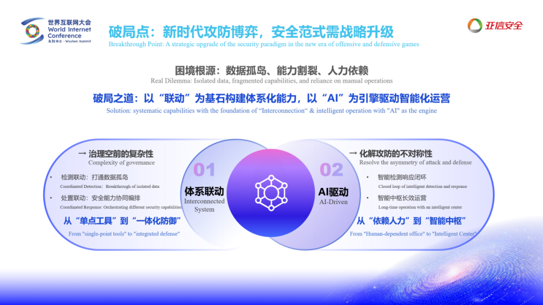 在此背景下,亚信安全副董事长、CEO 马红军出席网络安全技术发展与国际合作论坛,并在演讲中,系统阐释了在“体系化”与“智能化”双轨并行的新常态下,企业安全建设所面临的严峻挑战与核心困局,并擘画了以“智能、联动、共御”为核心的下一代安全范式,明确指出新时代的攻防博弈,亟需一场深刻的战略升级。