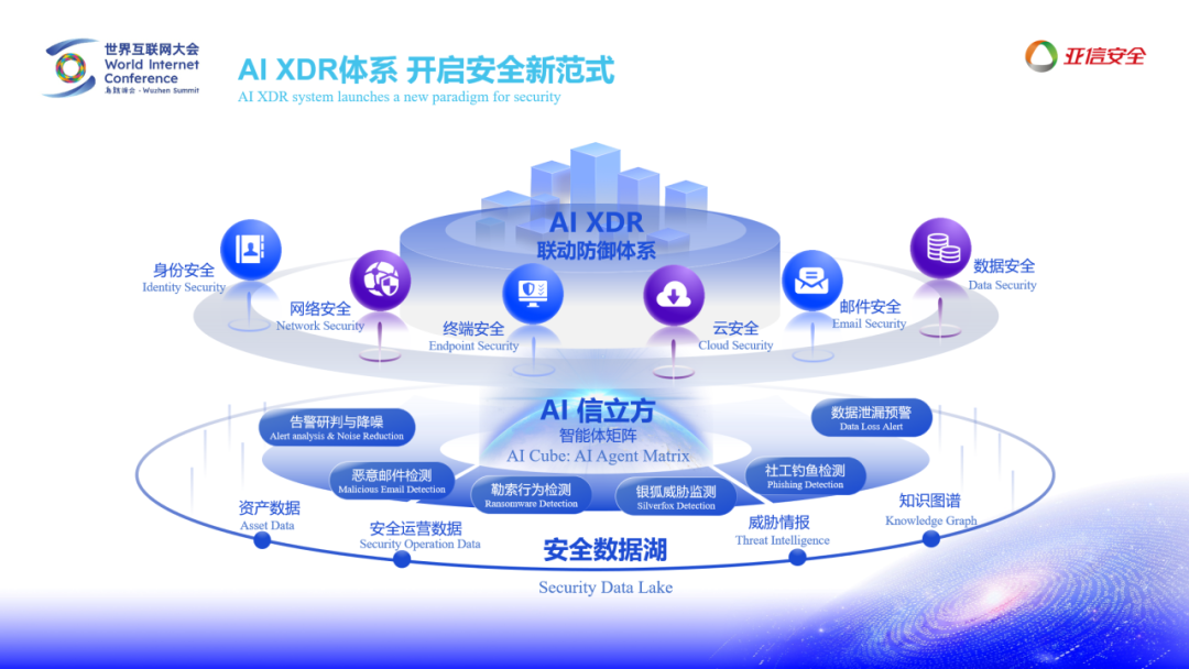 亚信安全今年正式发布了亚信联动防御系统AI XDR,以安全数据湖为认知底座,以自研安全大模型的智能体矩阵为支撑,全面承托身份安全、网络安全、终端安全、云安全、网关安全乃至邮件安全等多战线的一体化协同防护体系,重塑“主动、自动、联动”的现代安全新范式。