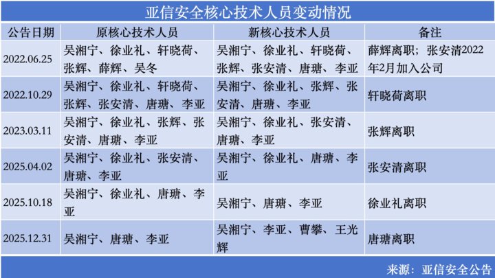 2022年10月、2023年3月、2025年4月、2025年10月,轩晓荷、张辉、张安清、徐业礼均陆续离职,公司核心技术人员队伍又从7人逐步缩小至3人;2025年12月31日,唐瑭也离职,公司将曹攀、王光辉认定为新的核心技术人员。
