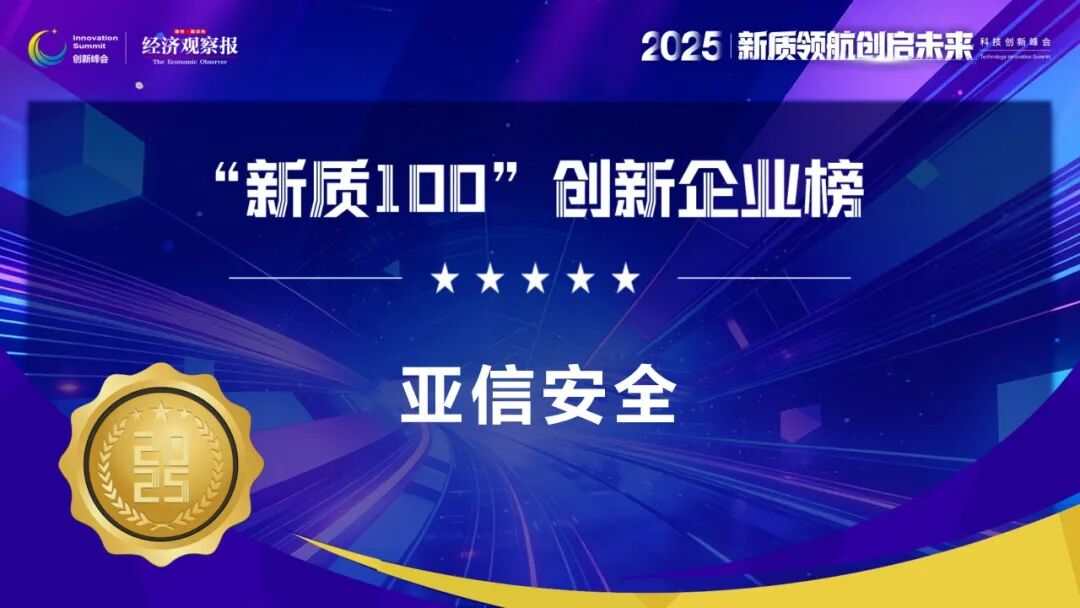 近日,由《经济观察报》主办的2025年度创新峰会隆重召开,会上重磅发布“新质100”创新企业榜。亚信安全凭借在“安全+数智”领域的深厚积淀与突出创新表现,成功入选该榜单,彰显了权威财经媒体与行业对亚信安全在新质生产力赛道上创新实践的高度认可。