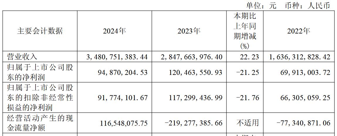 近日,威腾电气集团股份有限公司(以下简称“威腾电气”)发布2024年年度报告。报告显示,威腾电气2024年实现营业收入34.81亿元,同比增长22.23%;实现归母净利润9500万元,同比下降21.25%;实现扣非净利润9177.41万元,同比下降21.76%。