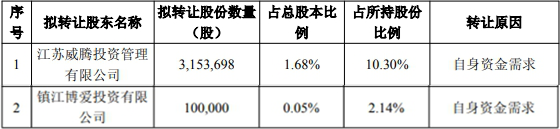其中,江苏威腾投资管理有限公司拟转让股份数量为3,153,698股,占总股本比例1.68%,占所持股份比例10.30%;镇江博爱投资有限公司拟转让股份数量为100,000股,占总股本比例0.05%,占所持股份比例2.14%。