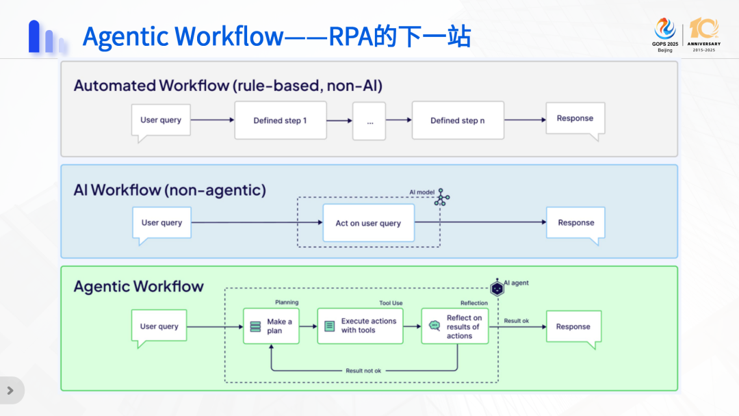 第一阶段是明确的自动化工作人员,不需要AI介入。比如给它一段固定脚本,它就能稳定执行,日复一年准确率很高。但这种方式非常固化——如果升级版本改了参数,整个工作流就必须调整。