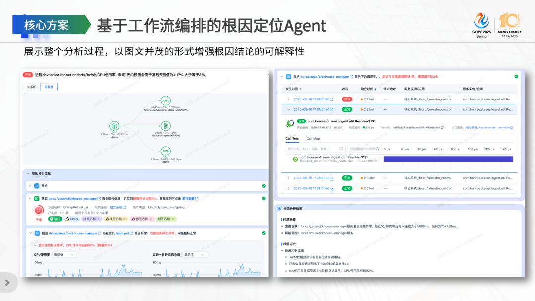 首先是快而准的机制。大家对“流程”并不陌生,它类似决策树,但又不完全是——因为流程中嵌入了大模型推理节点,能自主判断下一步动作。若把所有动作(比如 API 调用、命令执行)预先编排进流程,触发根因分析后,3~5 秒就能快速执行排查逻辑(比如点击“触发根因分析”按钮,流程瞬间启动)。这种方式沿着固定专家经验推进,执行明确、速度快,落地效果不错。