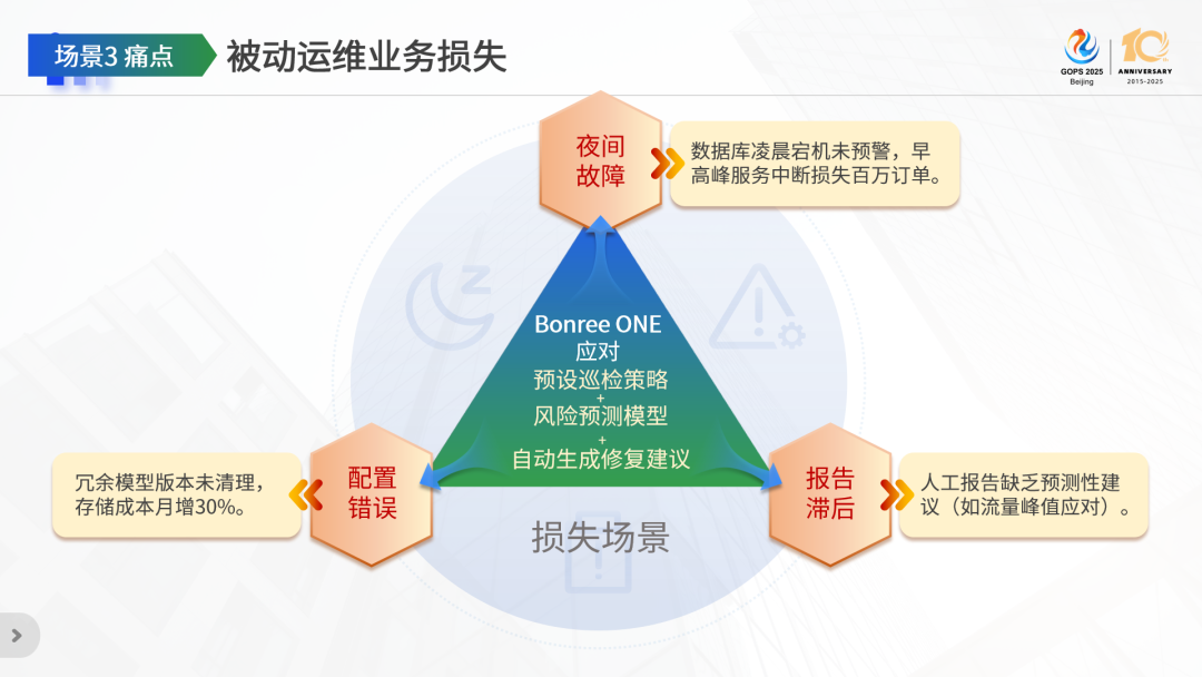 还有一个重点是解决被动运维的缺失。传统运维中,往往在故障产生显著影响后才察觉——例如上周进行的变更,因选择在业务低峰期(如周末夜间)实施,当时流量未达峰值而未暴露问题,但一旦进入业务高峰期,故障便会引发较大影响,形成被动应对的局面。
