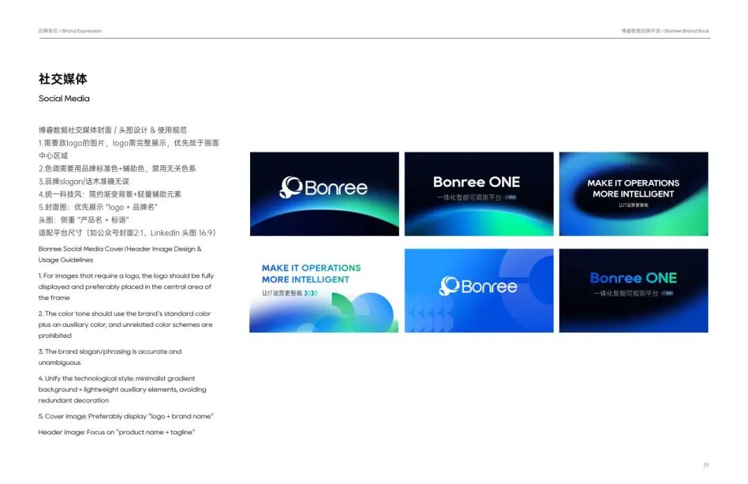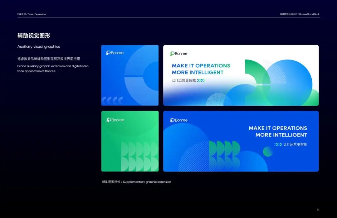 色彩体系选择上,我们以标志性的蓝绿渐变为主色——“洞察蓝”承载科技理性,呼应数据技术的精准可靠;“睿智绿”传递创新生机,契合数字化转型的活力属性。双色交融,共同诠释博睿数据“技术驱动+生态共生”的品牌基因,辅以衍生品牌渐变色,以流动感与层次感传递丰富科技内涵,为品牌注入满满活力。