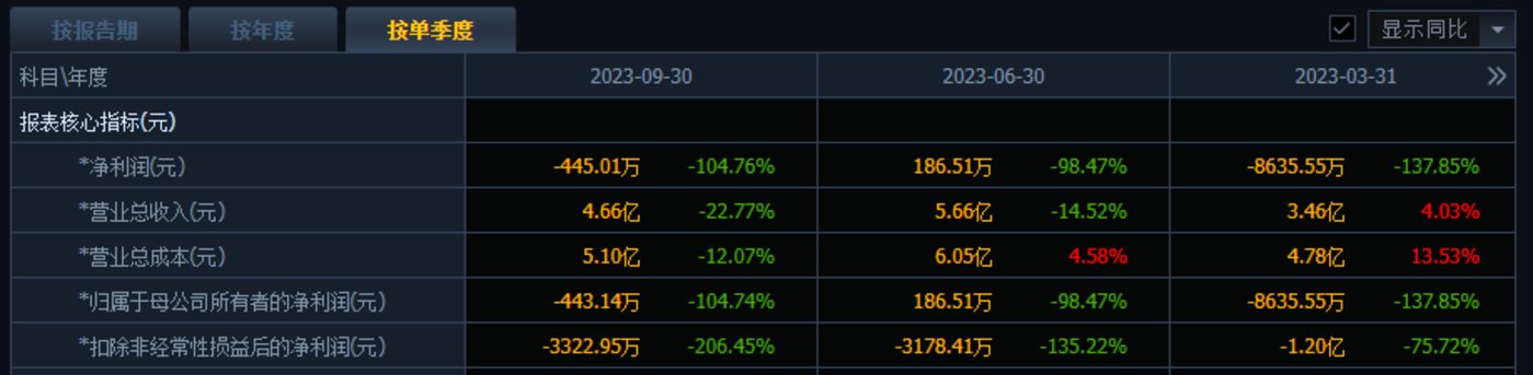 拆解来看,新点软件在Q1就已现大额亏损。Q1、Q2、Q3的营收分别为3.46亿元、5.66亿元、4.66亿元,归母净利润则出现较大波动,分别为-8635.55万元、186.51万元、-443.14万元。