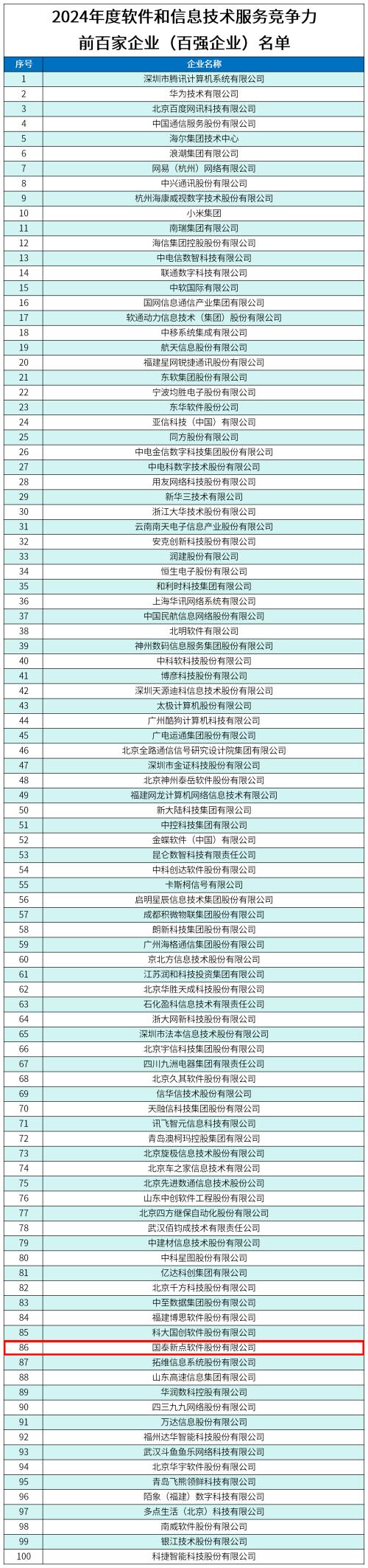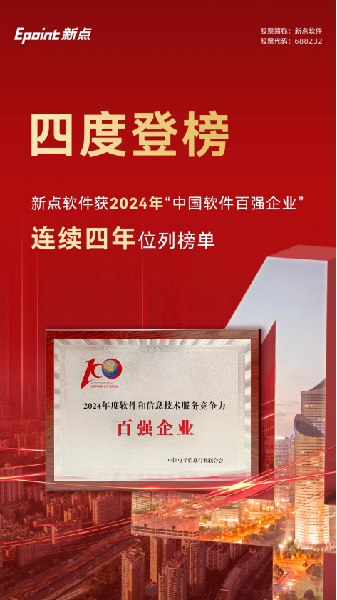 10月24日,在第二十六届中国国际软件博览会上,中国电子信息行业联合会发布了“2024年度软件和信息技术服务竞争力百强企业”榜单。自2021年首次入围百强榜单,新点软件已连续四年榜上有名。面对2024年复杂经营环境的挑战,这一荣誉更显珍贵。