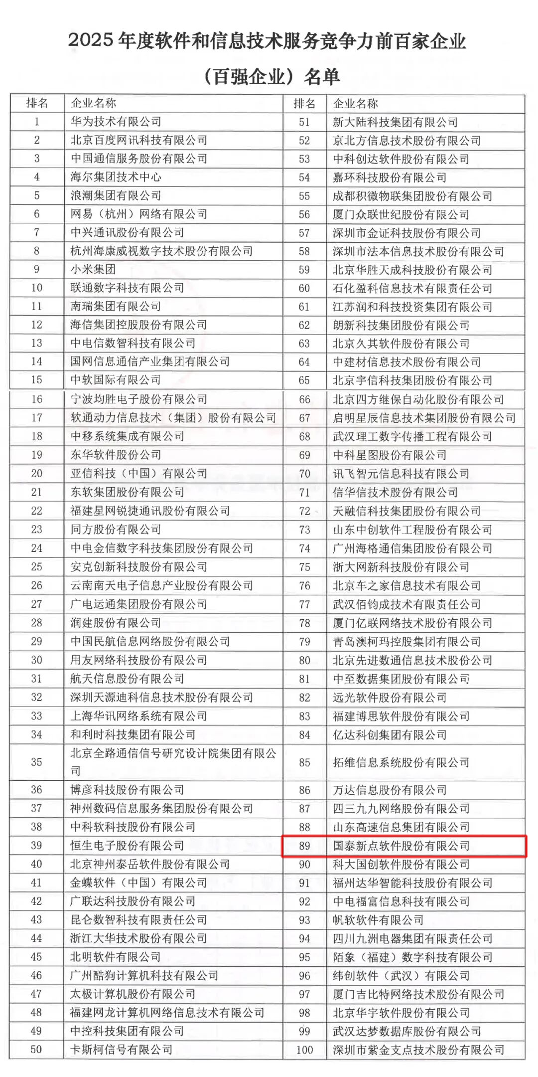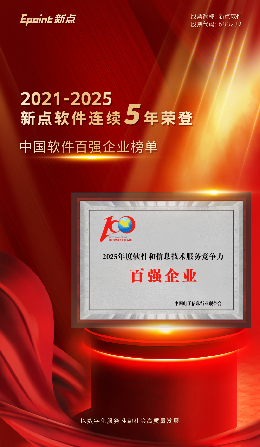 近日,中国电子信息行业联合会正式发布“2025年度软件和信息技术服务竞争力百强企业”榜单。凭借持续创新的技术积淀与深度赋能的行业实践,新点软件再度荣登榜单,连续五年稳居中国软件百强企业梯队。