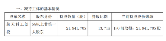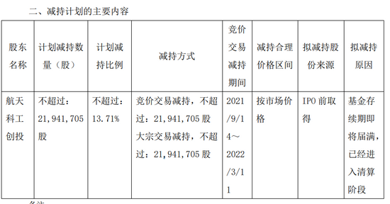 航天科工创拟通过集中竞价及大宗交易的方式减持合计不超过21,941,705股,拟减持股份占公司总股本的13.71%,也就是清仓减持。