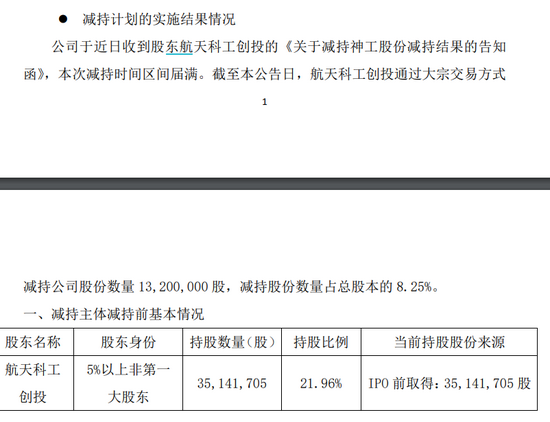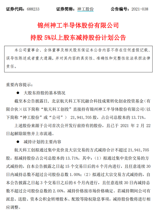 公告显示,航天科工创投直接持有锦州神工半导体股份有限公司(以下简称“神工股份”或“公司”) 21,941,705股,占公司总股本的13.71%。