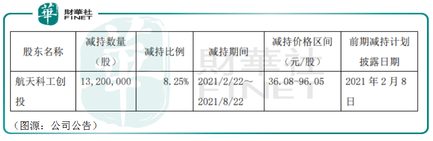 8月23日晚,公司发布公告称其大股东北京航天科工军民融合科技成果转化创业投资基金(以下简称“航天科工创”)计划通过集中竞价及大宗交易的方式减持合计不超过 21941705股,拟减持股份占公司总股本的 13.71%。