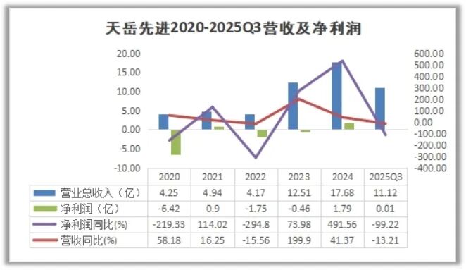 天岳先进近几年的业绩波动比较大,2022年上市当年便出现营收下滑并亏损7.75亿元,2023年营收大增仍亏损0.46亿元,2024年扭亏但非经常性收益占比超40%;2025年三季度营收11.12亿元,同比下降13.21%,净利润仅111.99万元,同比下滑99.22%。