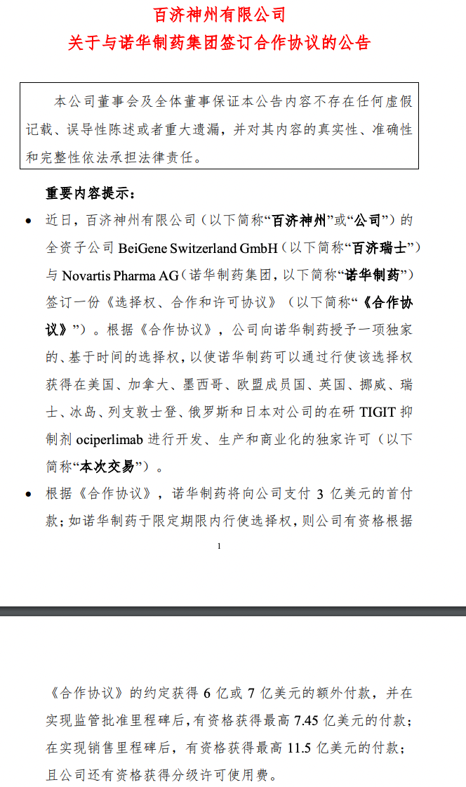 此前的2021年1月,诺华以22亿美元引进百济神州的PD-1抗体替雷利珠单抗,首付款高达 6.5 亿美元,总交易金额超过 22 亿美元,在当时同时创下两个国内最高纪录,首付金额最高、单品种授权交易金额最高。此次的TIGIT抗体是百济神州继替雷利珠单抗之后,与诺华达成的又一笔交易,也是双方合作的进一步深化。