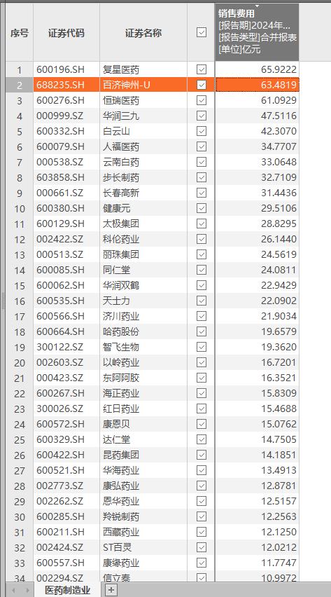 除了员工开支以外,百济神州销售费用也在持续攀升,从2017年的不足亿元增长至2023年的73亿元,2024年前三季度继续增长22.9%至63.5亿元。如下面表格所示,以2024年前三季度数据进行比较,百济神州销售费用在所有同行中位居第二位,仅次于复星医药。