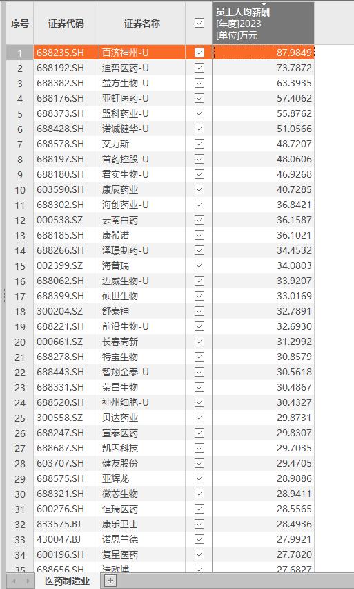 恒瑞医药(600276)作为药企一哥,2023年及2024年前三季度支付给职工以及为职工支付的现金分别为57.5亿元、46.1亿元,2023年人均年薪29.3万元。百济神州无论是总薪酬支出,还是人均年薪,都是显著高于前者。如下面表格所示,即便是与所有同行相比,百济神州的人均年薪也是高居首位。