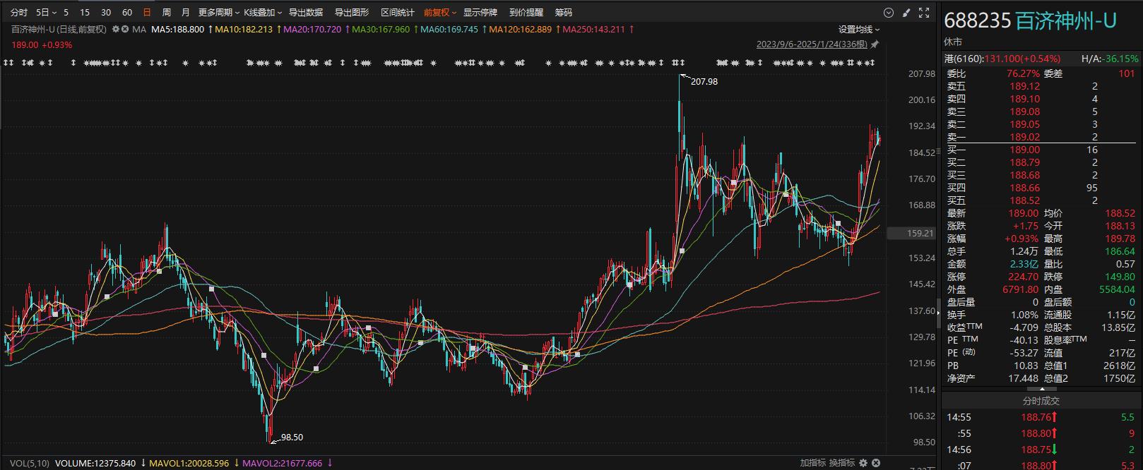百济神州(688235)股价近日表现强劲,先是1月14日跳空高开,收盘大涨9.44%,随后几个交易日持续走强,至今短短数日最大涨幅18.3%,市值最高涨412.6亿元。1月24日收盘,公司股价为189元,总市值2618亿元,距离历史新高只差一个涨停。