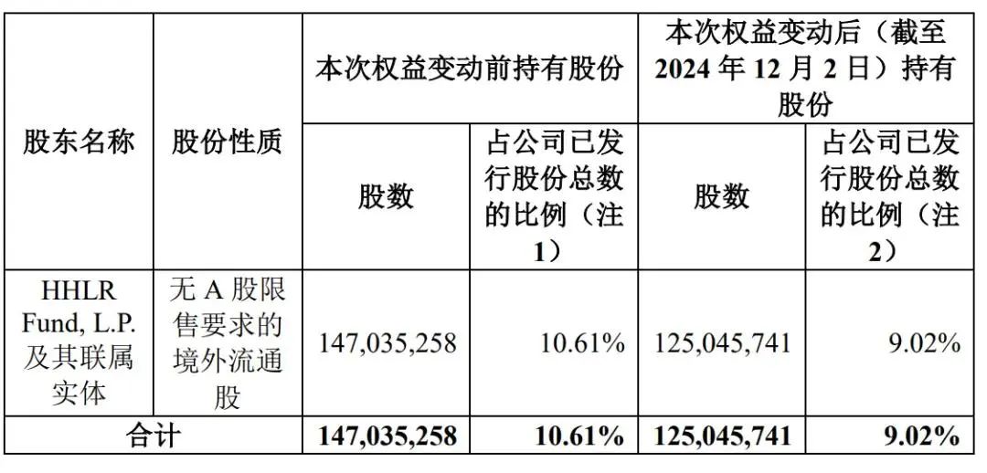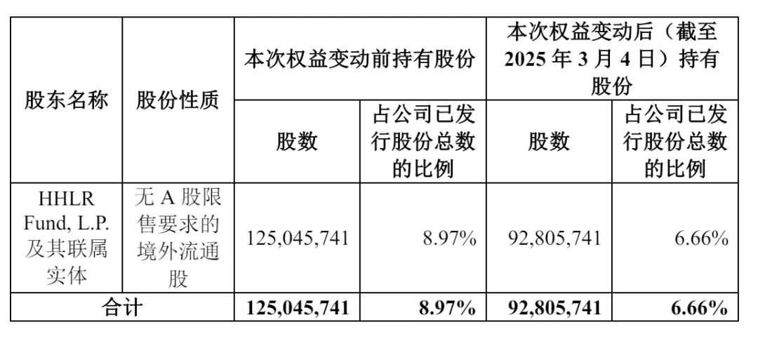 本次权益变动后,HHLR Fund, L.P.及其联属实体持有公司股份数量从125,045,741 股减少至92,805,741股,所持股份占公司已发行股份总数的比例从8.97%减少至6.66%。