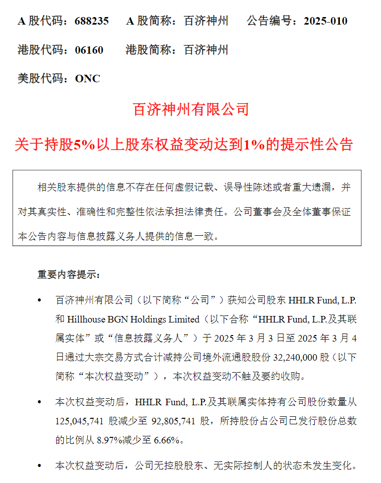 值得注意的是,HHLR是高瓴旗下基金,此前就曾大幅减持百济神州股票。