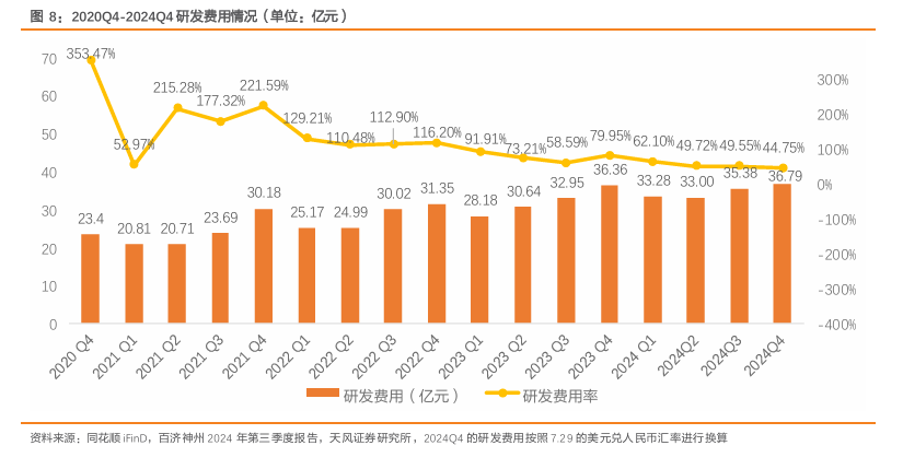 2024 Q4研发费用为5.42 亿美元,按照公司披露的美元数据计算可得,研发费用率为48%,同比减少30 pct,环比减少1 pct。
