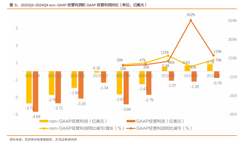 2024Q4研发费用为5.42亿美元,研发费用率为48%,同比减少30 pct,环比减少1 pct。2024Q4销售及管理费用为5.05亿美元,对应费用率为45%,同比减少21 pct,环比减少1 pct。经调整后2024Q4研发费用为4.75亿美元,研发费用率为42%,同比减少27 pct,环比略增2 pct;经调整后2024 Q4销售及管理费用为4.33亿美元,对应费用率为38%,同比减少19 pct,环比持平。
